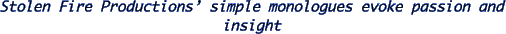 "Land's End" closed on August 2nd. The Monologues featured Arron Morgan as Coy; Pat Van Rhyn as Nance Dude; and Jason Sumabat-McGreggor as Jessie Racer. Said Judith Jett Jesness in Focus, "It is superbly cast and admirably directed. There is certainly music in his language. Stolen Fire delivers the goods." And, Billy Houck of New Times wrote: "Land's End is like an adventure to a strange land. The guide is Gary Carden, a playwright with a palpable feel for the rhythm and beauty of the spoken word. Don't miss it."