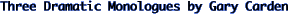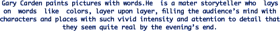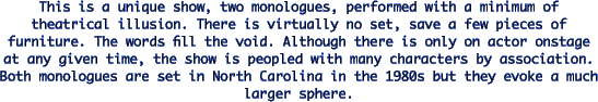 The Raindrop Waltz is a Stolen Fire production presented in cooperation with the Pewter Plough Playhouse. I had to say that. You see, it is because of Stolen Fire (a production company dedicated to producing brand new plays) that this wonderful work is being produced here in Cambria; it's West Coast premiere actually. Gary Carden gave me permission to produce this work to help out Stolen Fire's finances, to act as seed money so that Stolen Fire may try to bring Gary Carden's Land's End to Los Angeles. (For more info see: "http://www.fix.net/~stolenfire/letters.html#let4") (For those of you that may be unfamiliar with the Land's End trilogy, Nance Dude, which starred Pat Van Rhyn, is the central piece to those three wonderful monologues). Anyway, I asked Jim Buckley about renting the Pewter Plough Playhouse as a venue for The Raindrop Waltz