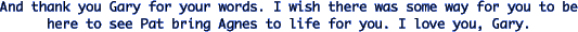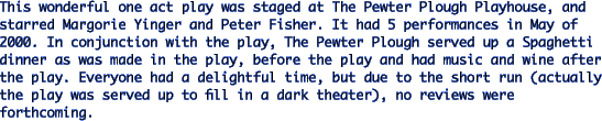 Looking at You, Kid, a new monologue by Mary Wilds. Premiered at The Pewter Plough Playhouse in Cambria. Performances were July - Aug 2000 featuring Rosann Balbontin. Looking at You, Kid was a "comedy about stalking and domestic violence." Looking at You, Kid shared billing with: The return of Gary Carden's Nance Dude with Pat Van Rhyn reprising her role as Nance. Sooner or later I'll find the reviews for these plays and post them then. Needless to say, the plays were very, very well received.